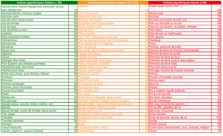NB : l’ IG d’un aliment peut changer après la cuisson (ex : une carotte crue a un IG faible. La cuisson augmente son IG) Cette liste n’est qu’un tableau à titre indicatif (ex : une brioche industrielle aura un IG élevé. Mais si faite maison (farine bis, sucrant à bas IG, lait d’amande, purée d’amande blanche...), son IG sera moindre. Il en va de même pour le pain,muesli, céréales, riz au lait…)