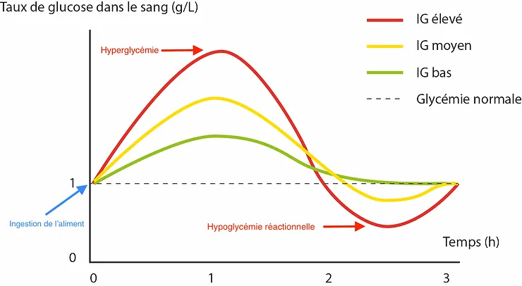 L’index glycémique (IG) est un critère de classement des aliments contenant des glucides, basé sur leurs effets sur le taux de glucose dans le sang (glycémie) durant les deux heures suivant leur ingestion. Chaque aliment a un IG mesurable de 0 à 100 : plus l’IG est élevé, plus le sucre contenu dans l’aliment passe rapidement dans le sang, ce qui provoque un «pic» glycémique (notre corps reçoit trop de sucres d’un coup). Afin de normaliser et de baisser ce «pic» trop élevé, notre corps (notre pancréas) libère de l’insuline (substance qui a le pouvoir de faire chuter le taux de sucre). Plus le le «pic» est haut, et plus le pancréas libérera de l’insuline... ce qui entraine un état d’hypoglycémie qui peut se manifester par plusieurs signes : coup de fatigue, nervosité, envie de sucre, ...