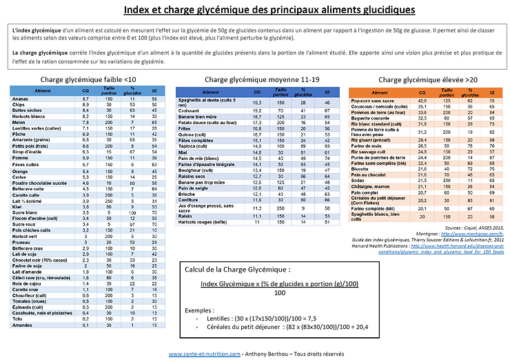 Calcul de la charge glycémique (CG) : Index glycémique (IG) X le nb de gramme de glucides de cet aliment par portion (100g).